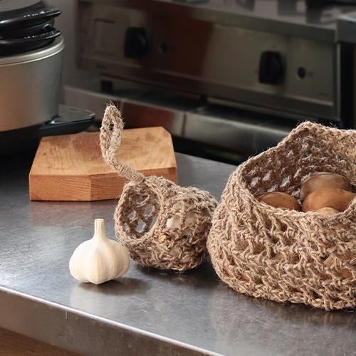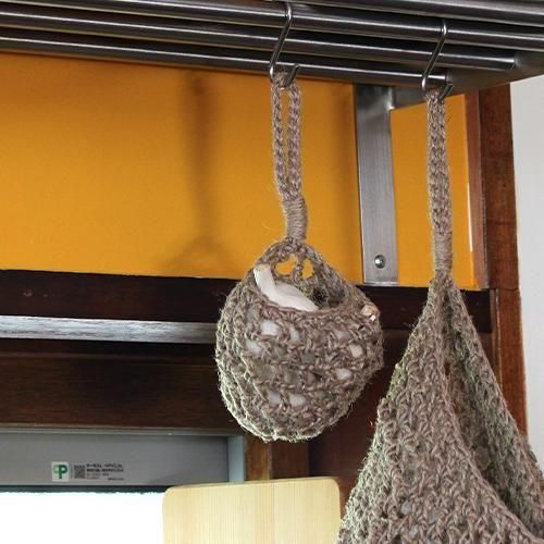 にんにくや玉ねぎなどの常備野菜を通気良く収納でき、キッチンに吊るすだけで 心地よいナチュラルな雰囲気を添えてくれます。